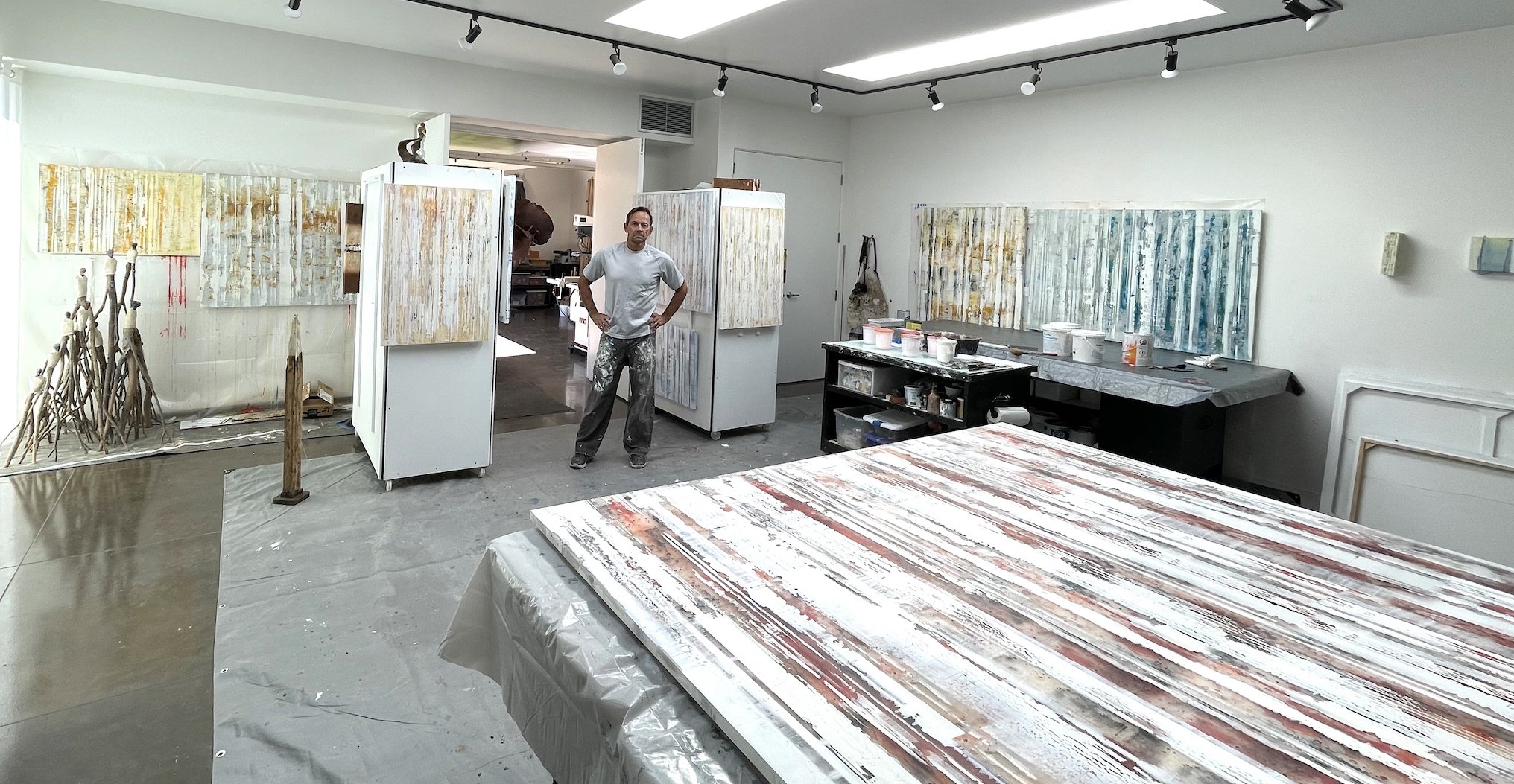Ragland’s current series “Parallel Layers” pulls from his figurative work where he began experimenting with plexiglass, resin and transparent materials. The symbiotic relations between acrylic paint and the plexiglass surface generates a magical translucency and transparency of the materials allowing for a shallow depth not unlike a leaf or twig embedded into a frozen surface. He begins with total abandonment and spontaneity. Throwing, dribbling, splattering and pouring paint onto the surface, removing his hand from the process and allowing the materials to generate an artistic reaction. Being patient and layering upon layering upon layering until intuition moves him to use his hands. Then he uses squeegees and unconventional tools to create structure, geometry and composition. With these tools he makes a variety of marks and textures to move the eye through the entirety of the painting. A push and pull between adding and subtracting material completes the process. “Parallel Layers” does not rely on the recognizable and familiar. It draws the viewer to the unfamiliar yet recognizable based on their own layered memories.